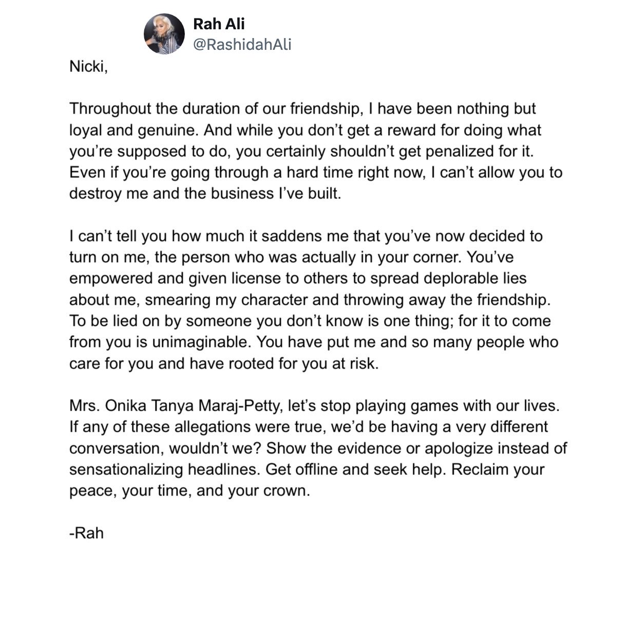 In a surprise open letter, Rah took aim at Minaj for “turning on me” and “empowering others to spread deplorable lies.”
