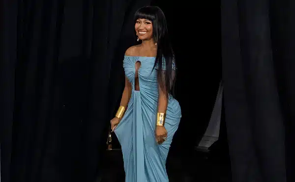 Donning a Maison Schiaparelli blue dress accented with gold cuff bracelets and drop earrings, the GRAMMY-nominated rapstress shined at the event’s red carpet before hurrying inside to catch a glimpse at ‘Melania.’