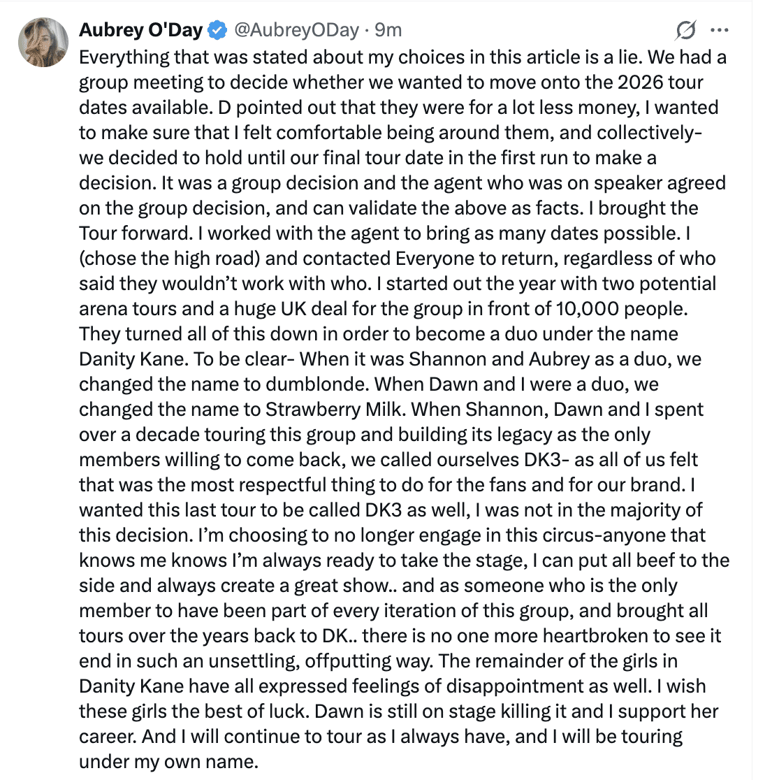 We also want to address claims that anyone is being excluded… plans were in place to include Aubrey O’Day in 2026 for a 20-year anniversary celebration. Aubrey declined to participate and refused to sign the paperwork.”