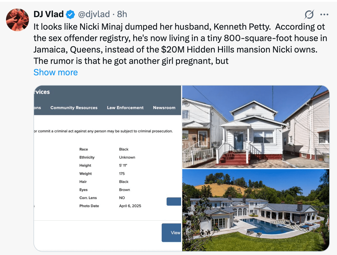 “It looks like Nicki Minaj dumped her husband, Kenneth Petty. According ot the sex offender registry, he’s now living in a tiny 800-square-foot house in Jamaica, Queens, instead of the $20M Hidden Hills mansion Nicki owns.”