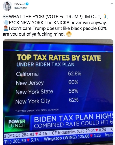 Another Rich person complaining. VOTE FOR BIDEN he trynna take from the RICH to help the POOR. The problem is the rich always forget where they came from and always want more. Only anyone making over $400k a yr will be affected and at this point YALL already filthy rich. 50 cent is a SELL OUT. Clearly money over what’s right.