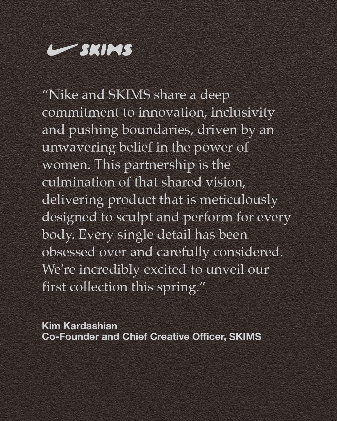 “We’re energized by the opportunity to build a new brand and shake things up for the next generation of athletes with NikeSKIMS. This partnership brings together the best of both brands and unlocks an incredible opportunity to disrupt the industry with our shared passion and commitment to innovation. We will invite even more athletes into sport and movement with product that makes them feel strong and sexy.”