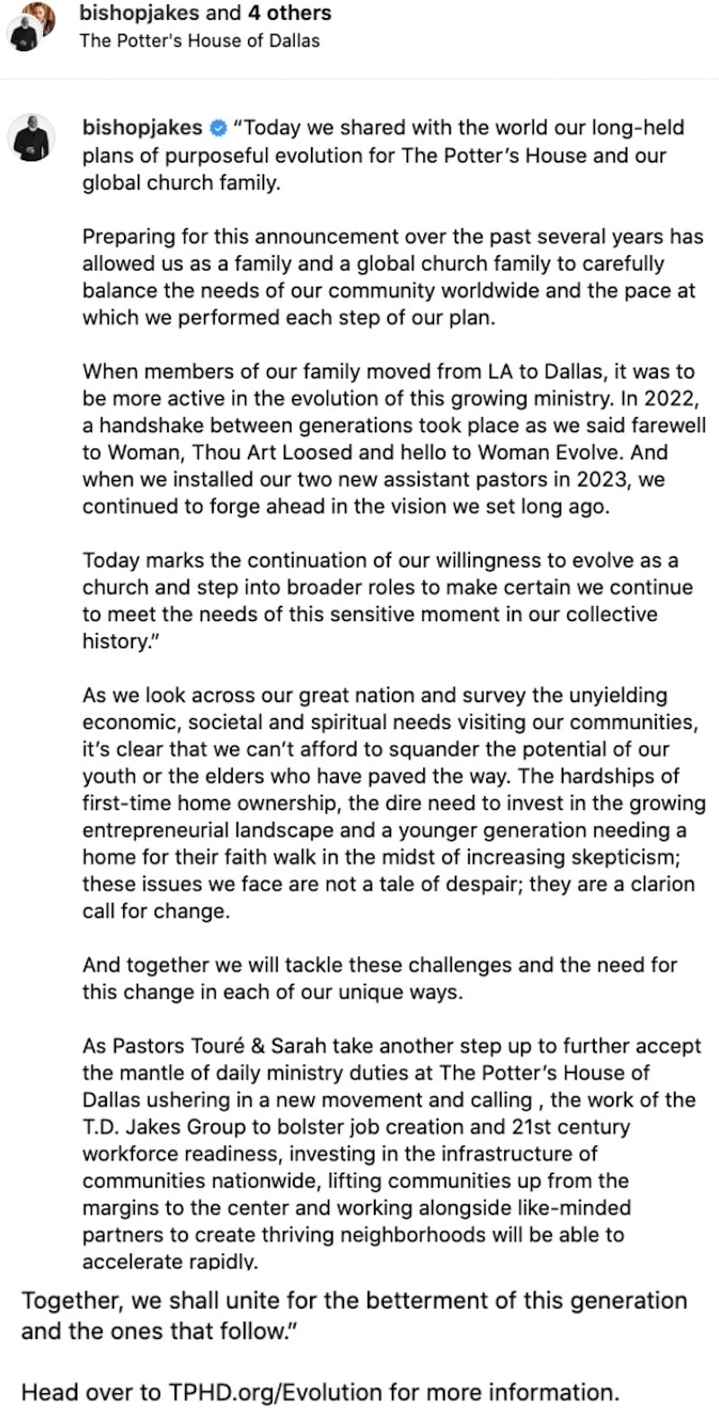 “Today we shared with the world our long-held plans of purposeful evolution for The Potter’s House and our global church family.
