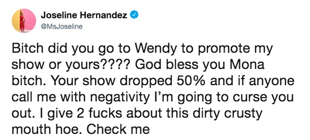 The scathing words come after Mona’s appearance on the Wendy Williams Show, during which she was asked about Joseline and answered (6.39 mark):