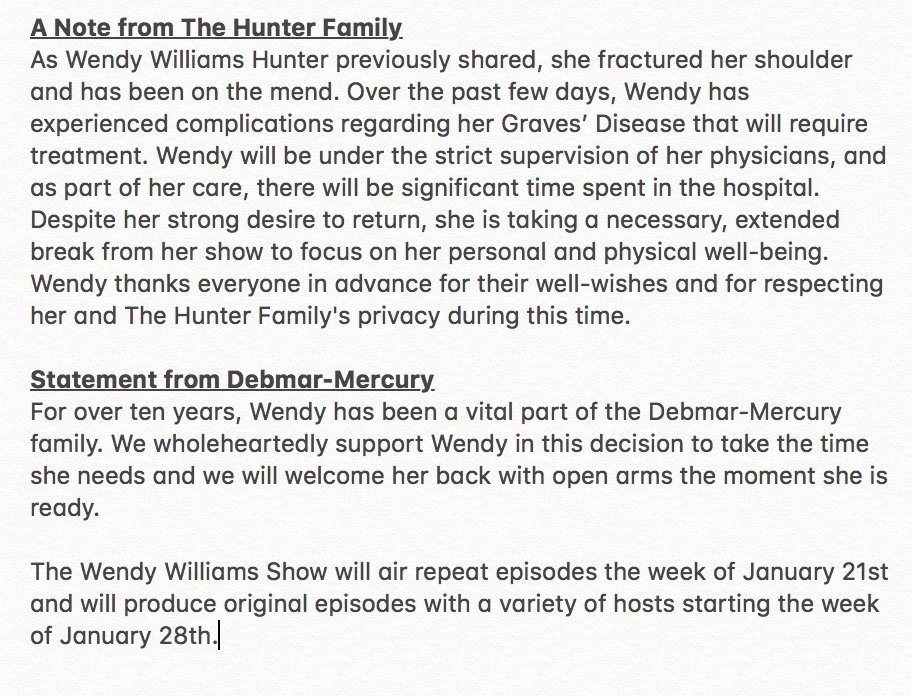 See, Williams – whose show has been fronted by a series of guests this week – was due back in her famed pink seat next week. However, in a joint statement from “The Hunter Family” and the show’s producers, it’s been confirmed that her break has been extended due to further health concerns and a hospitalization.