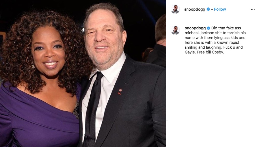 The witch hunt is about to start. No, Snoop, f*** YOU for turning a blind eye for R Kelly and your other abuser friends. You can’t come for Oprah when you’ve been doing the exact same. Being mad at the Kobe situation is one thing but to say “Free Bill Cosby” and racialize the conversation solely from a male perspective, as if black women are not more vulnerable than women of other races to sexual abuse is r*** is male privilege B*******.