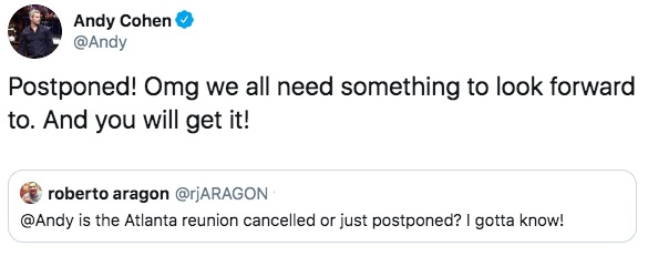 Yet, anchor Andy Cohen alleviated worry – confirming that it has been postponed (not cancelled):