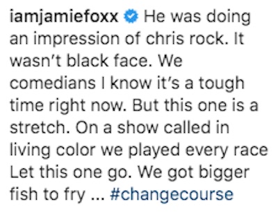 “He was doing an impression of chris rock. It wasn’t black face. We comedians I know it’s a tough time right now. But this one is a stretch. On a show called in living color we played every race Let this one go. We got bigger fish to fry … #changecourse”