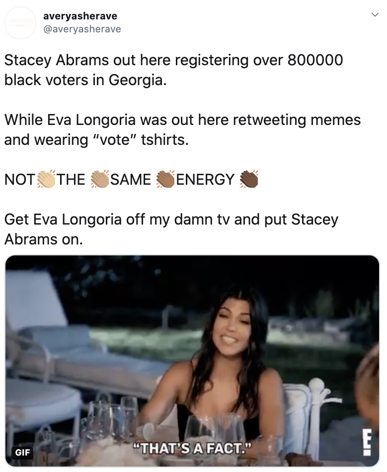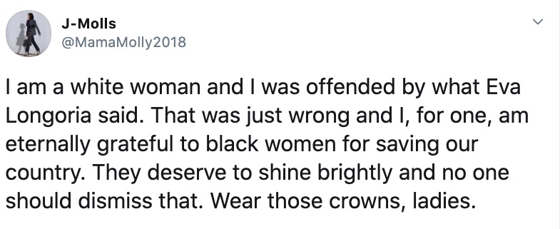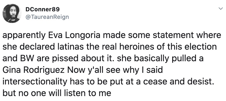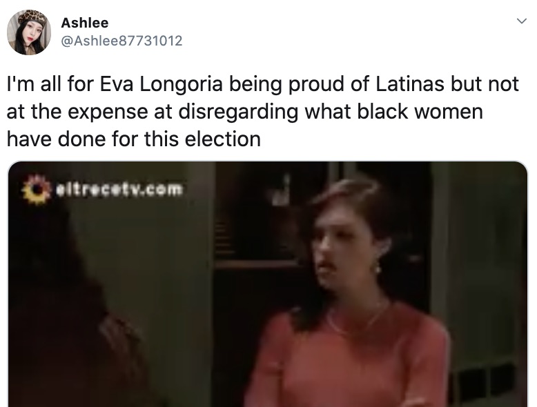TGJ stop spreading this nonsense…it’s not a competition among women of color as to which group among us made the largest contribution. The point is all women of color contributed significantly. We can’t afford and don’t have the time or luxury to be bickering among us. Ignoring the few people on Twitter who are bickering over something that doesn’t matter. I’m going to give her the benefit of the doubt and assume that she just wanted to make sure the contribution of Latina women is not being overlooked and is being as recognized as that of black women. We have other things to concentrate on (like the runoffs in Georgia) and need to continue working together for the benefit of all of us.