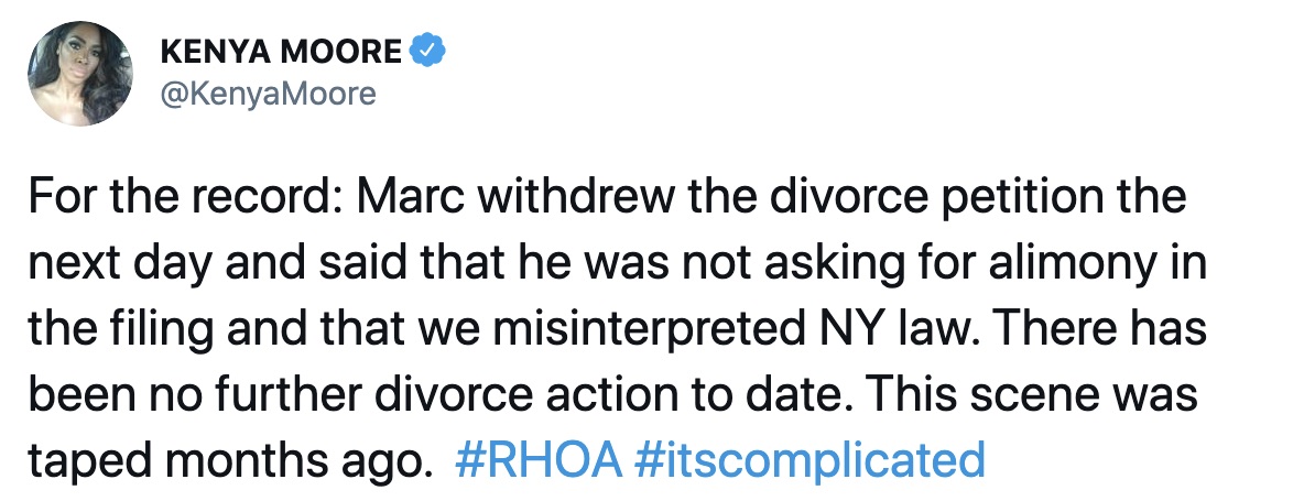 For the record: Marc withdrew the divorce petition the next day and said that he was not asking for alimony in the filing and that we misinterpreted NY law. There has been no further divorce action to date. This scene was taped months ago. #RHOA #itscomplicated