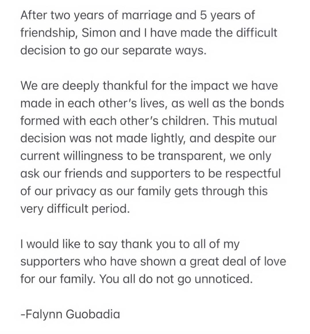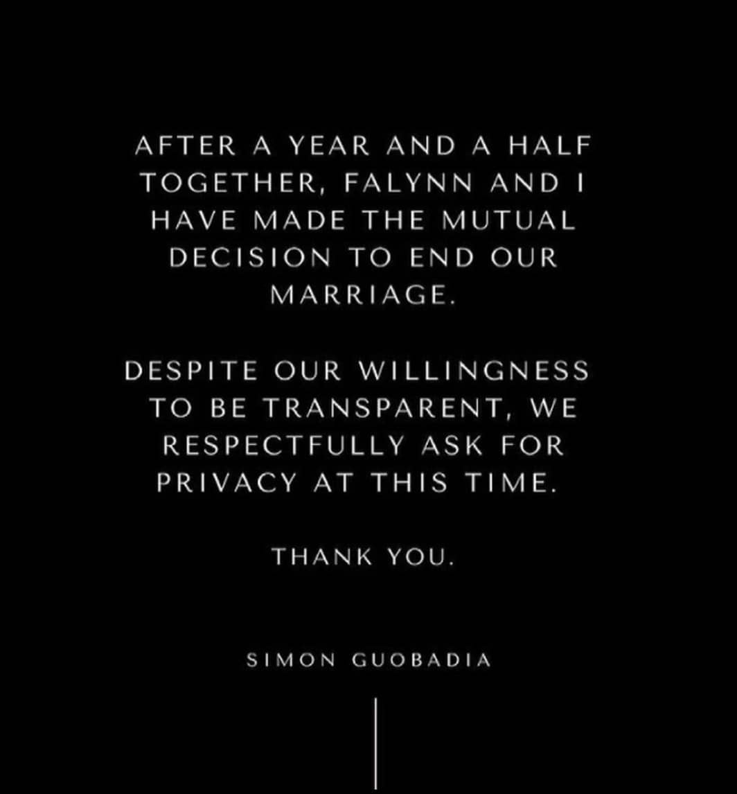Moments ago, newcomer Falynn Guobadia announced that she and her husband Simon Guobadia are ending their marriage of two years. They’ve been together for a total of five years.