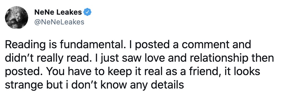 “Reading is fundamental. I posted a comment and didn’t really read. I just saw love and relationship then posted. You have to keep it real as a friend, it looks strange but i don’t know any details.