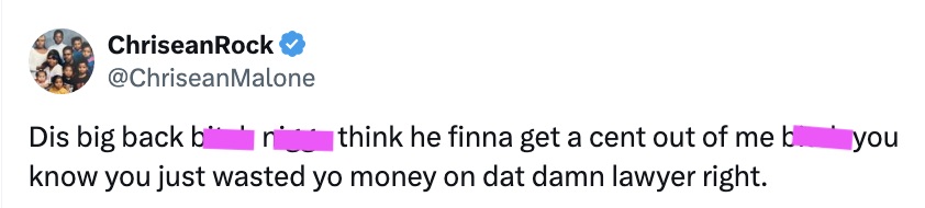 “Dis big back b*tch n*gga think he finna get a cent out of me b*tch you know you just wasted yo money on dat damn lawyer right.”