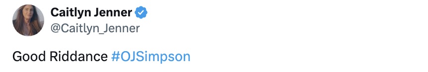 Indeed, prior to today’s tweet, Caitlyn wrote in her memoir that O.J. was “the most narcissistic, egocentric, neediest a**hole in the world of sports I had ever seen” and accused him of getting away with “two savage murders.” She also claimed Robert Kardashian was open about his alleged belief that his friend O.J. was indeed guilty of the crimes he was accused of.
