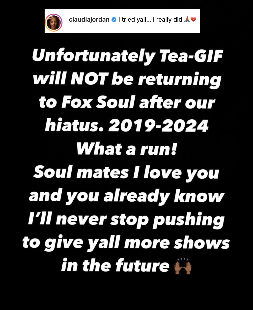 “Unfortunately, Tea-GIF will NOT be returning to Fox Soul after our hiatus.