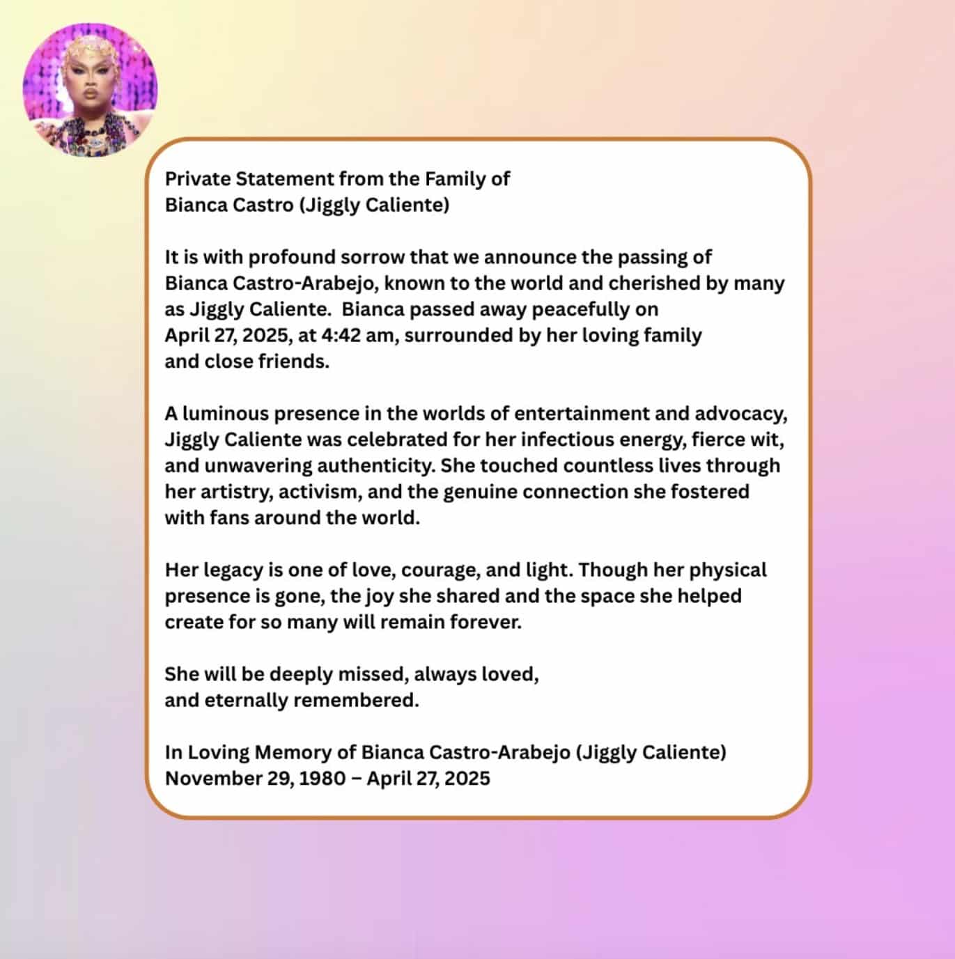 “Private Statement from the Family of Bianca Castro (Jiggly Caliente)