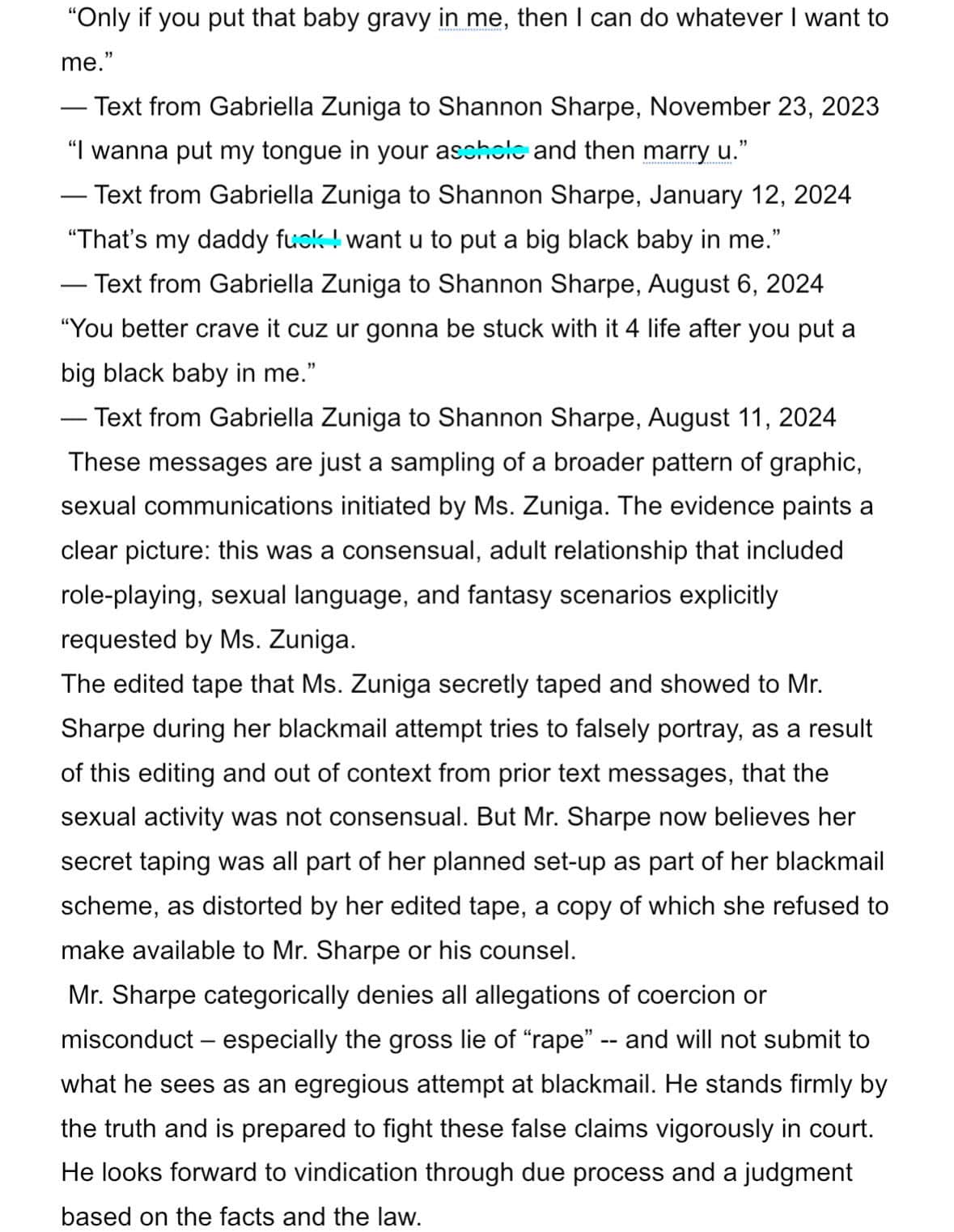 Text from Gabriella Zuniga to Shannon Sharpe, August 11, 2024 These messages are just a sampling of a broader pattern of graphic, sexual communications initiated by Ms. Zuniga. The evidence paints a clear picture: this was a consensual, adult relationship that included role-playing, sexual language, and fantasy scenarios explicitly requested by Ms. Zuniga.