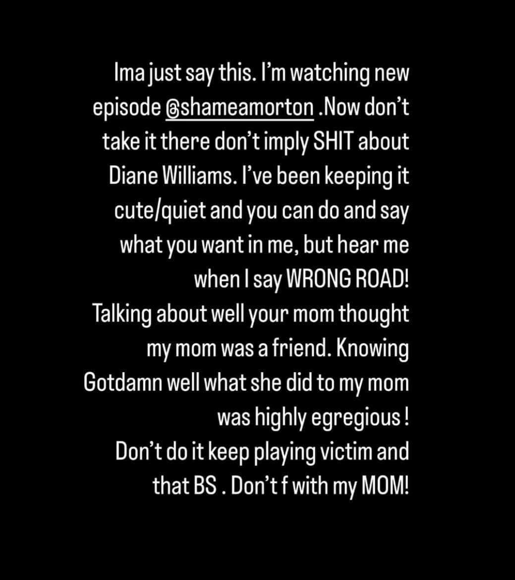 “Ima just say this. I’m watching new episode @shameamorton. Now don’t take it there don’t imply SH*T about Diane Williams. I’ve been keeping it cute/quiet, and you can do and say what you want in me, but hear me when I say WRONG ROAD!