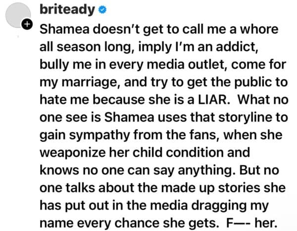 “Shamea doesn’t get to call me a wh*re all season long, imply I’m an addict, bully me in every media outlet, come for my marriage, and try to get the public to hate me because she is a LIAR. What no one see is Shamea uses that storyline to gain sympathy from the fans, when she weaponize her child condition and knows no one can say anything. But no one talks about the made up stories she has put out in the media dragging my name every chance she gets. F– her.”