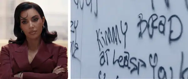 The store’s white walls were found covered in black spray-painted phrases, including “we need that” and “Kimmy Bread”.