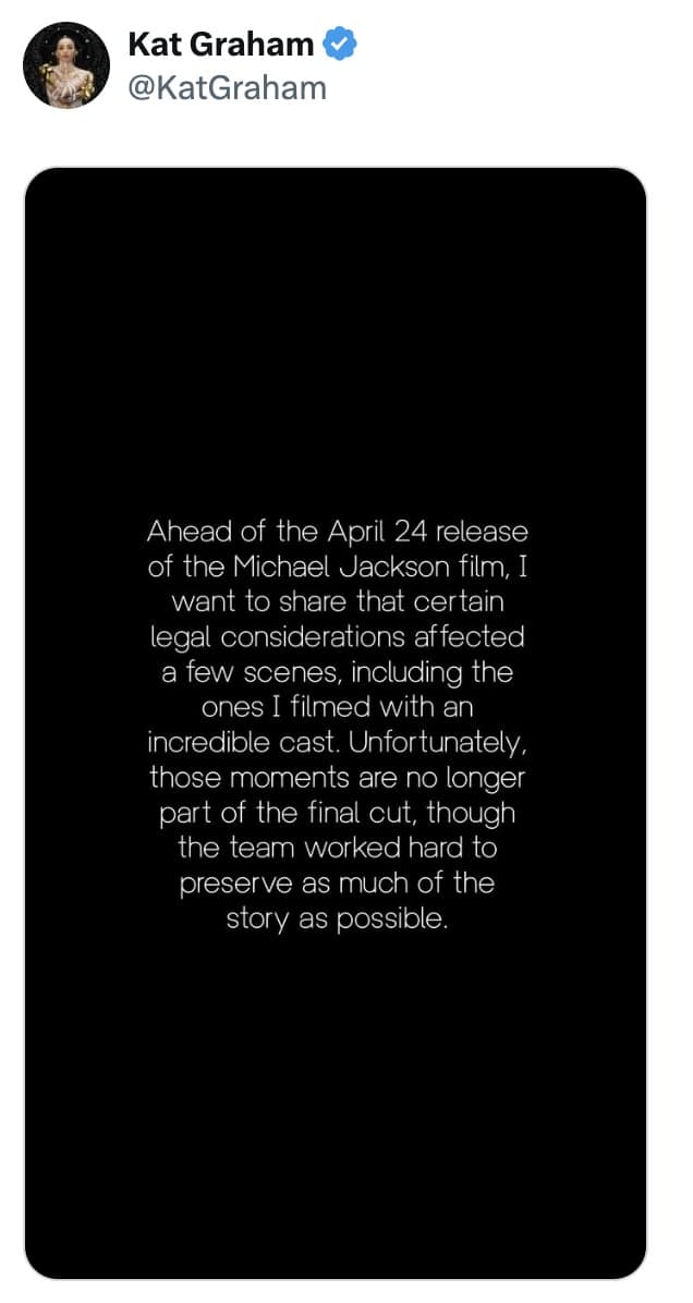 “Ahead of the April 24 release of the Michael Jackson film, I want to share that certain legal considerations affected a few scenes, including ones I filmed with an incredible cast. Unfortunately, these moments are no longer part of the final cut, though the team worked hard to preserve as much of the story as possible.”